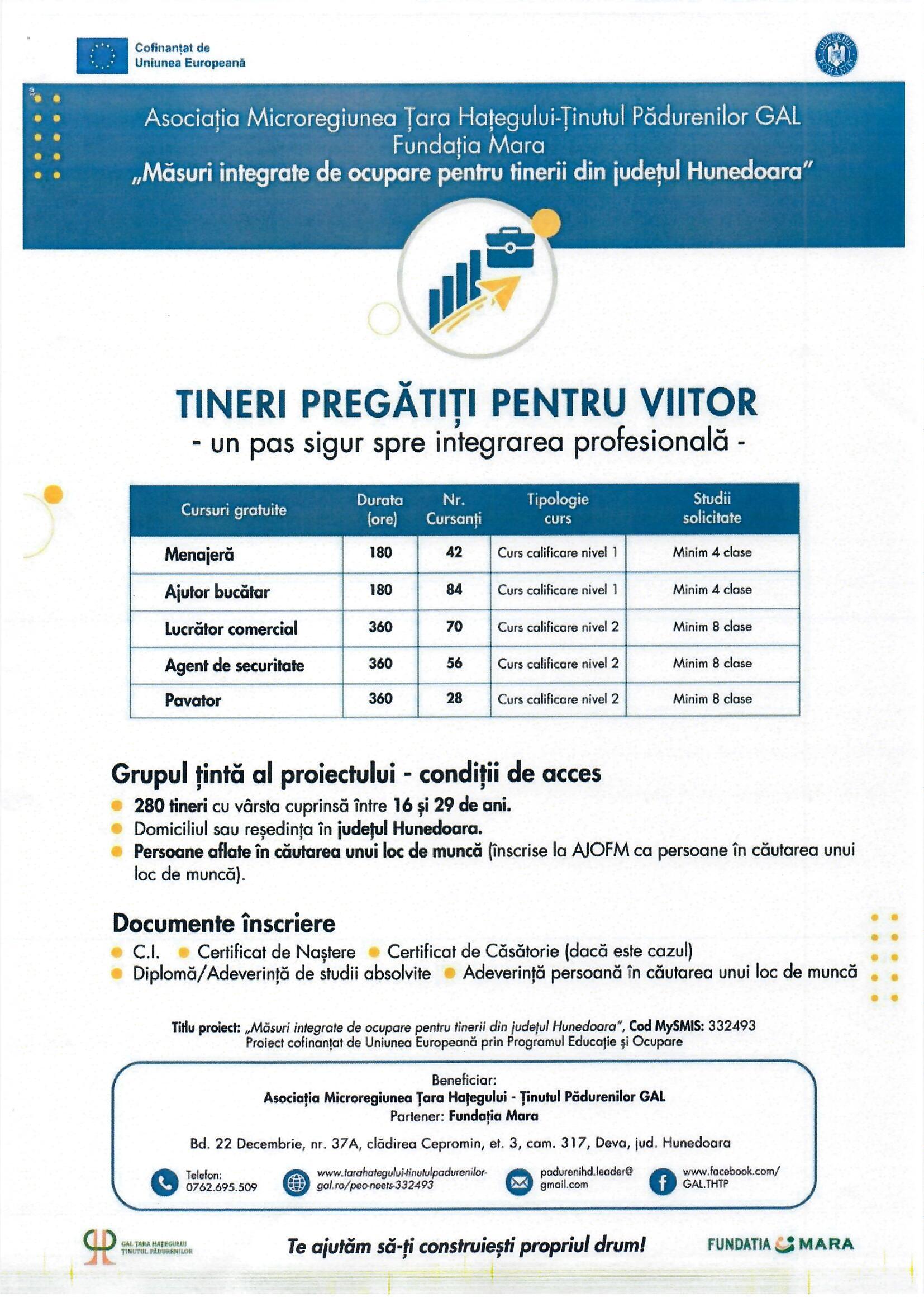 Asociatia Microregiunea Tara Hategului-Tinutul Padurenilor GAL invita tinerii cu varsta cuprinsa intre 16 si 29 ani sa participe la activitățile GRATUITE oferite in cadrul proiectului „Masuri integrate de ocupare pentru tinerii din judetul Hunedoara” (cursuri gratuite, activitati de informare si consiliere profesionala, etc), finantat prin Programul Educatie si Ocupare 2021-2027.