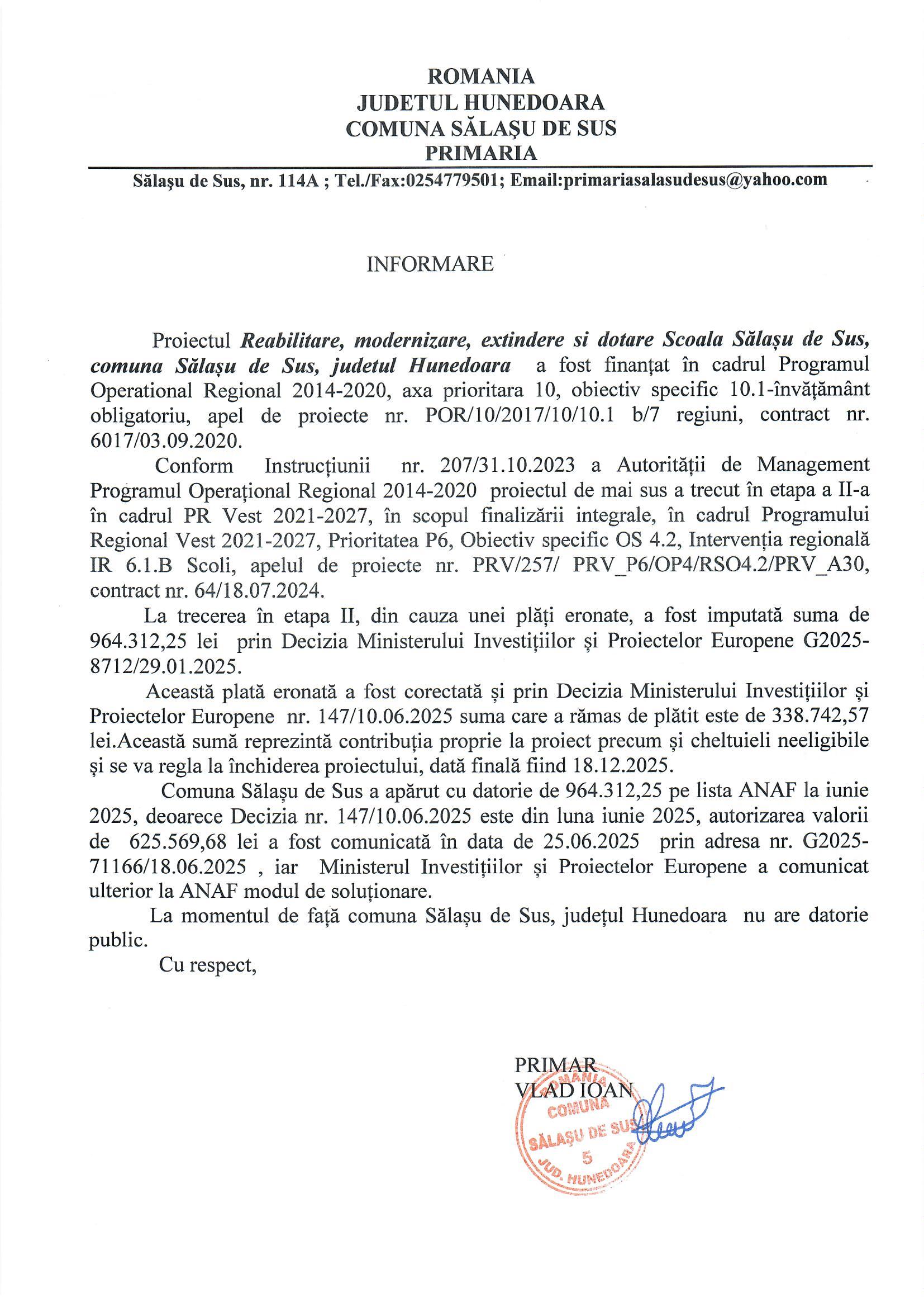 Acest serviciu vă oferă cele mai recente informații din partea Primăriei și Consiliului Local al Comunei Sălașu de Sus.